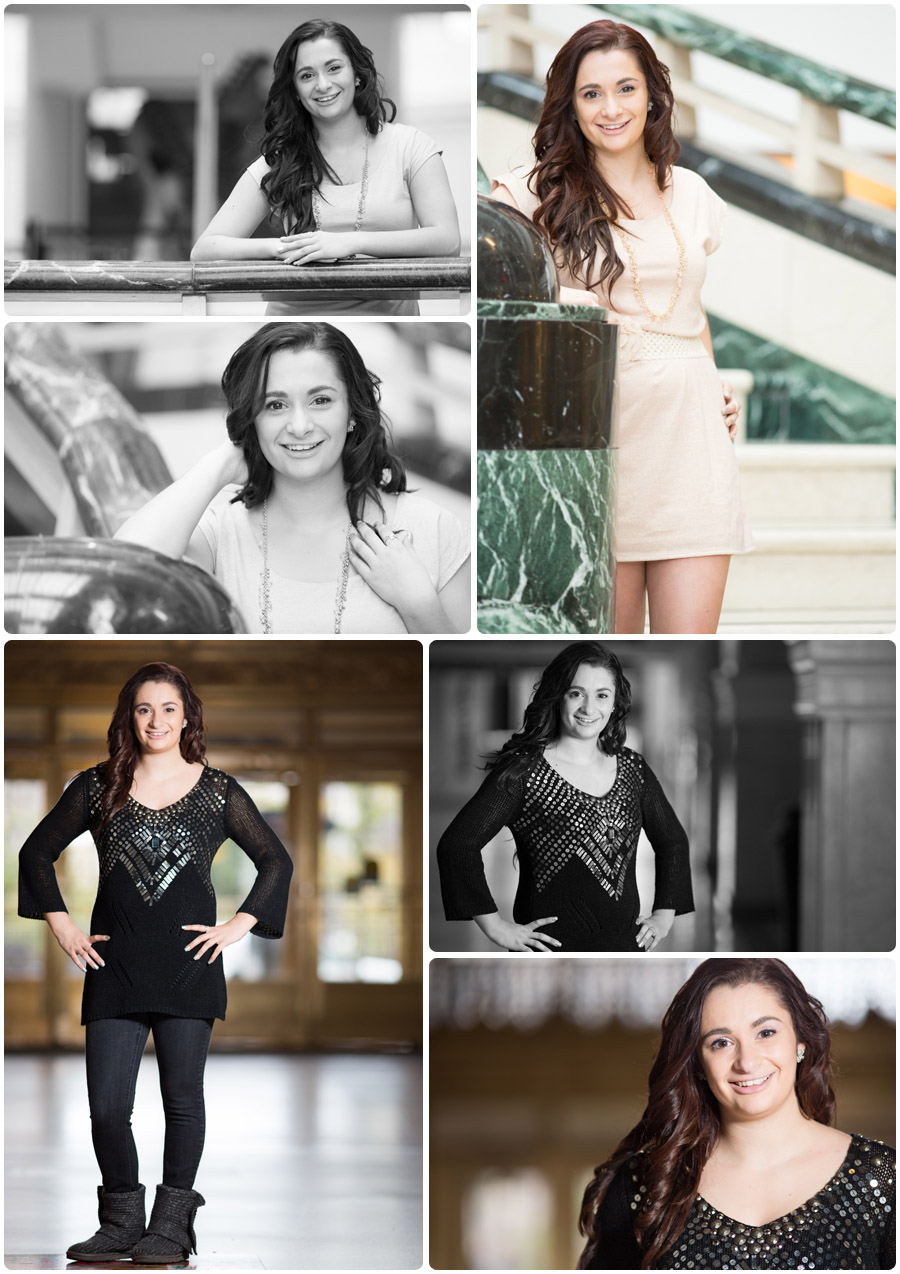Sitting here listening to the rain this morning and thinking back to how it was a cold and rainy morning just like this when I met up with Ashley for her senior portrait session.  Fortunately, her mom had made arrangements for us to stay dry and warm inside Tower City in downtown Cleveland.  We got there early in the day when the mall area was still fairly empty and quiet and made our way from the Grand Staircase and fountain around to the front doors by Public Square, taking advantage of any spot that looked interesting.