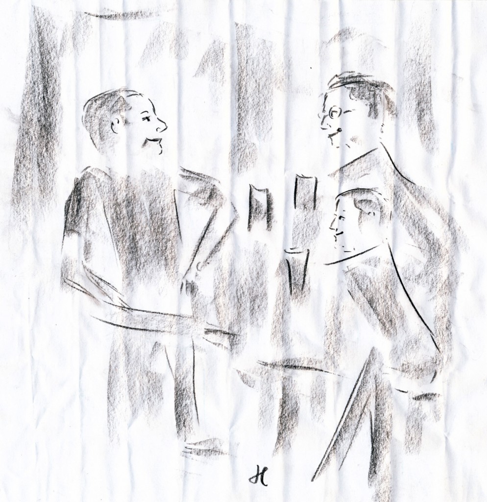 I stayed in Bonn, Germany for the first part of the trip. When my secret double agent day job was over, the evenings were filled by taking the train into the City Center and strolling the streets. On one such evening, an elderly man approached myself and the group I was with and began rattling off some story in German. I don’t know a lick of German. When he finally paused to take a breath, we informed him we were American. The whole story started over in English. At this point he also proceeded to sit right down at our table. He told us tales of hiking across the US back in the 1950s, about how much something cost in Central Park (we should have paid more attention to this part) and the movie “An American in Paris”. Then he pulled a small pad of paper from his bag and began to sketch us.